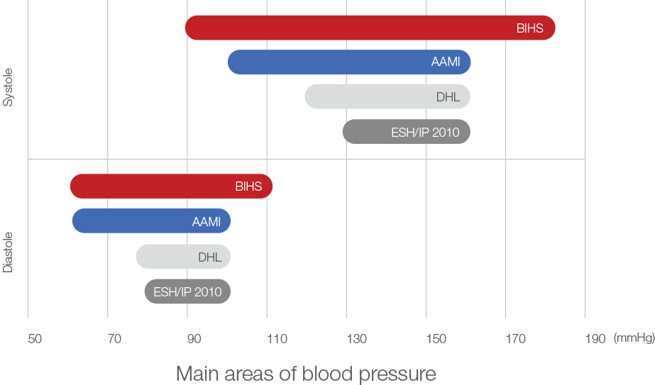 Another difference is the blood pressure ranges examined. The blood pressure ranges in which the blood pressure monitors are checked for measuring accuracy differ depending on the test protocol (see graph). The broader the range is, the better the devices are checked to be reliable at extremely low or extremely high blood pressure.